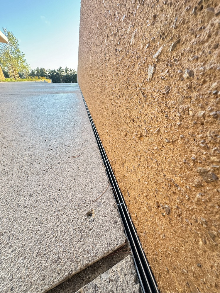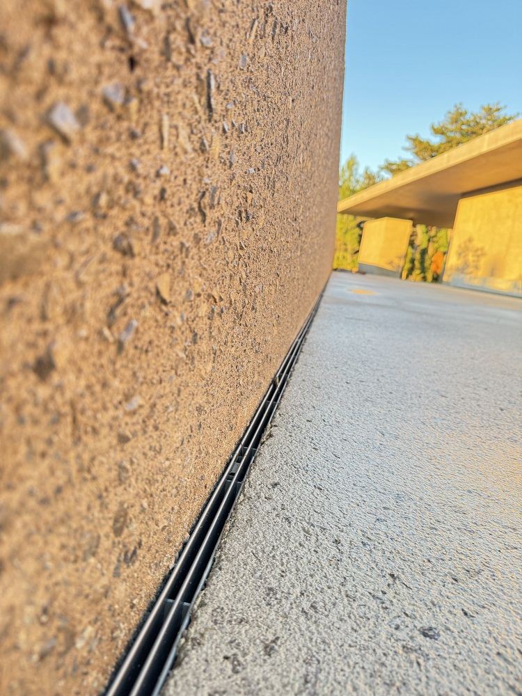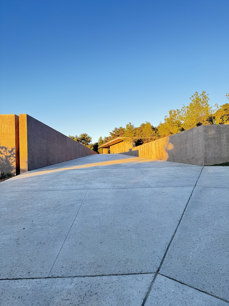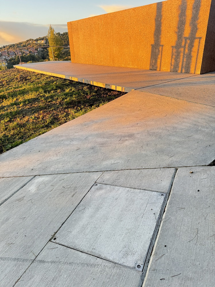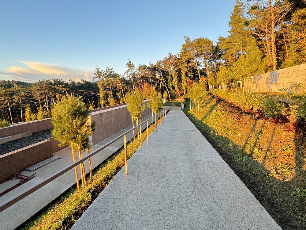 Tvori ga pet teras, zarezanih v pobočje. Na prvi stoji poslovilni objekt, ki ga pokriva velika železobetonska plošča z okroglo odprtino sredi stropa, skozi katero prodirajo drevesne veje. Pokopališče je odeto v zamolkle barve, v rjave odtenke in barvo sredozemske rdeče prsti. Poleg barv zidove zaznamujejo tudi različni načini površinske obdelave.