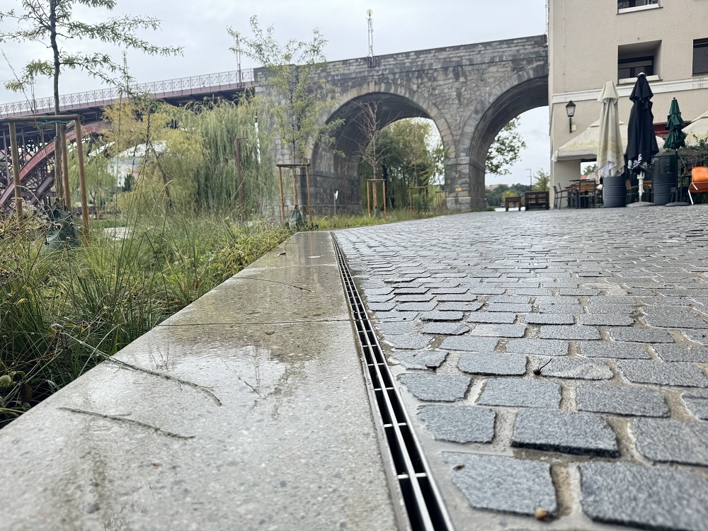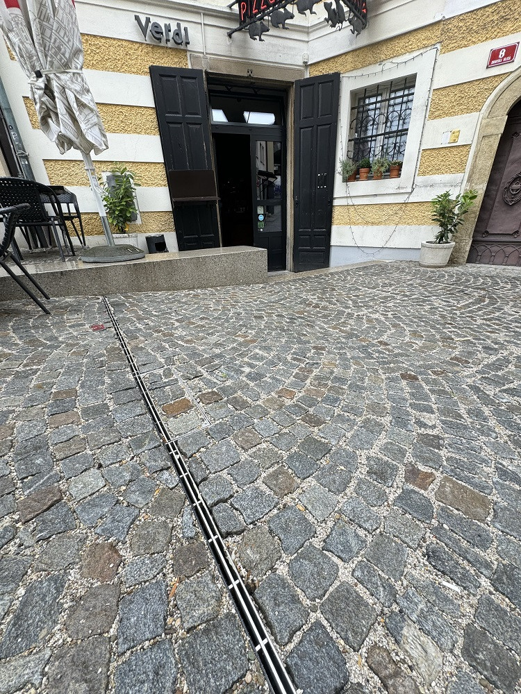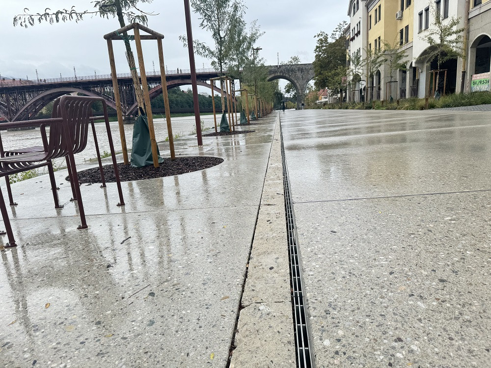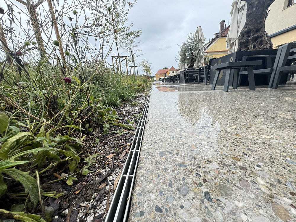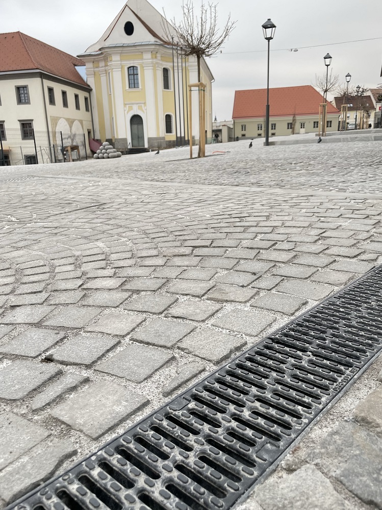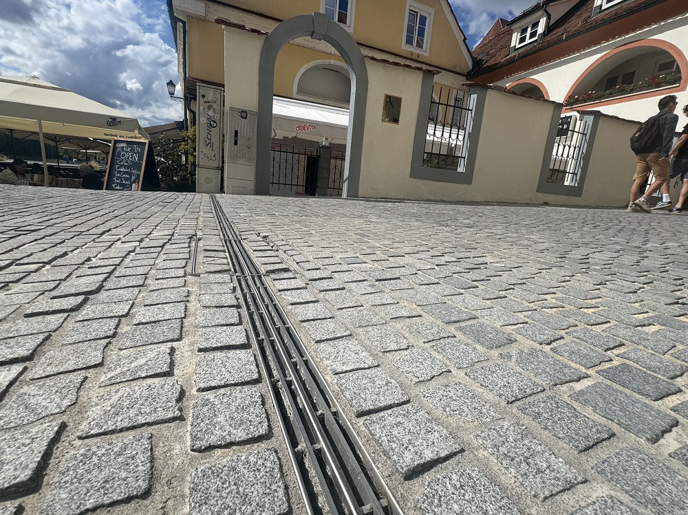 Za zbiranje in odvodnjavanje deževnice so uporabljeni ACO Toptek pokrovi za zapolnitev z granitnimi kockami ter ACO Drain Multiline linijski požiralniki z ACO SlotTop nastavki z rego. Rezultat je elegantna preprosta eleganca.