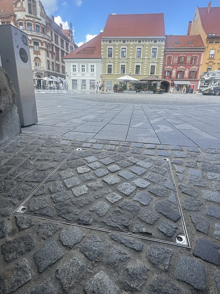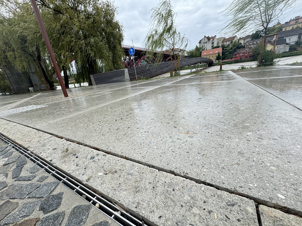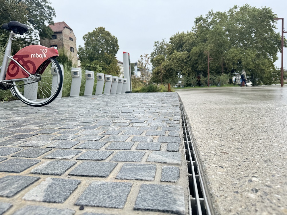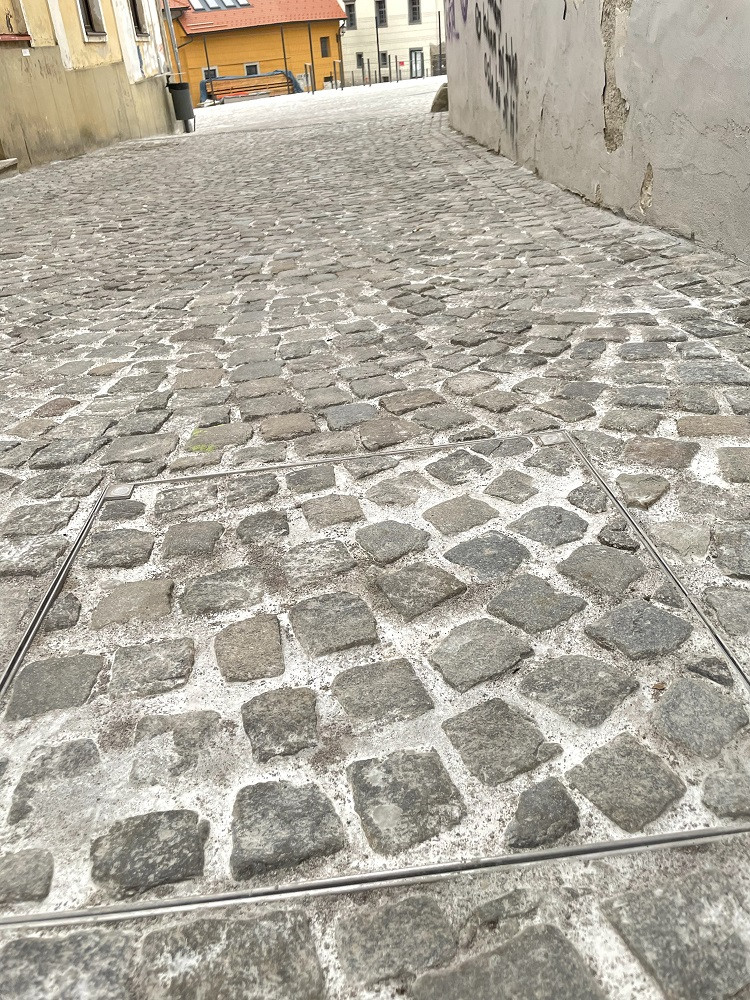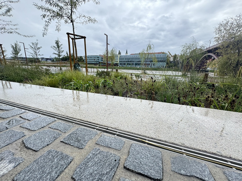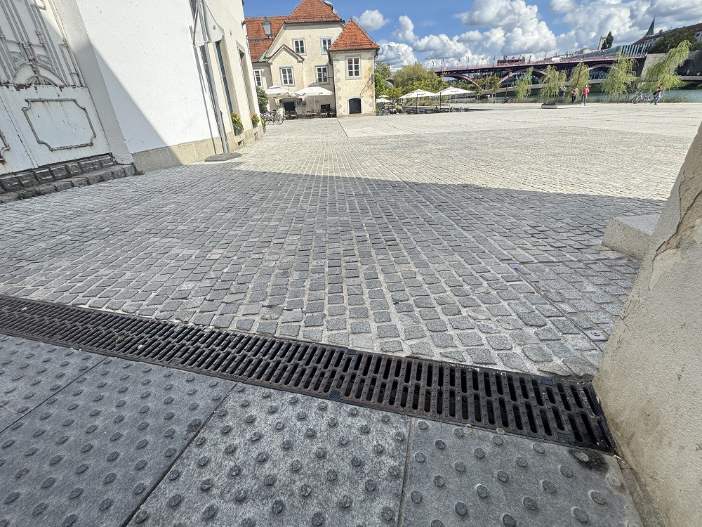 Za zbiranje in odvodnjavanje deževnice so uporabljeni ACO Toptek pokrovi za zapolnitev z granitnimi kockami ter ACO Drain Multiline linijski požiralniki z ACO SlotTop nastavki z rego. Rezultat je elegantna preprosta eleganca.